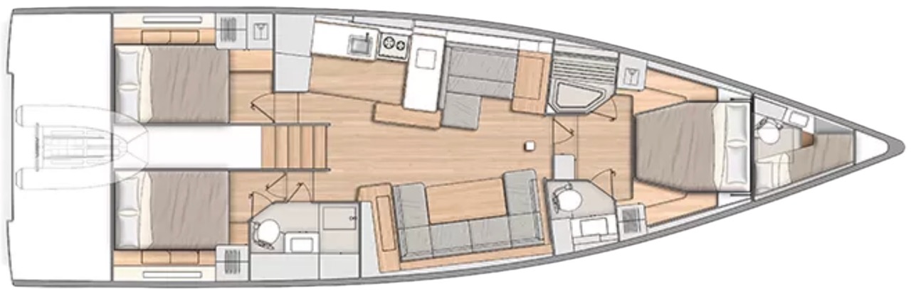 3 cabins – 2 bathrooms – skipper cabin with bathroom